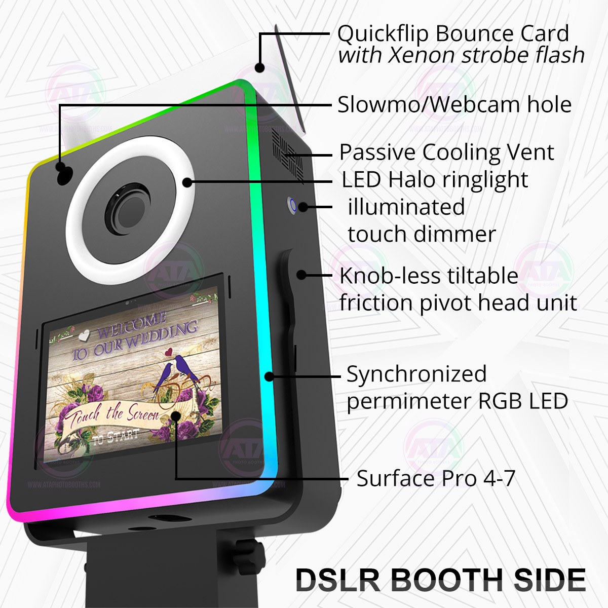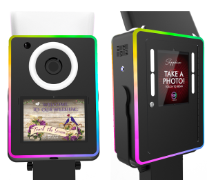 ATA Photobooths Flagship Booth, the Lumia Series is our most advanced product in the market. With 8 years in the making. features a DUAL action Photobooth ipad on one side DSLR on the other side. fully seamless RGB LED permiter edge that allows customized the Theme of your event. It has over 300 preset!