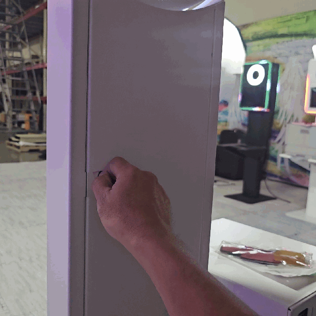 The Photobooth is engineered with a hidden hinge door mechanism that facilitates user access to the internal battery and power supply compartment.